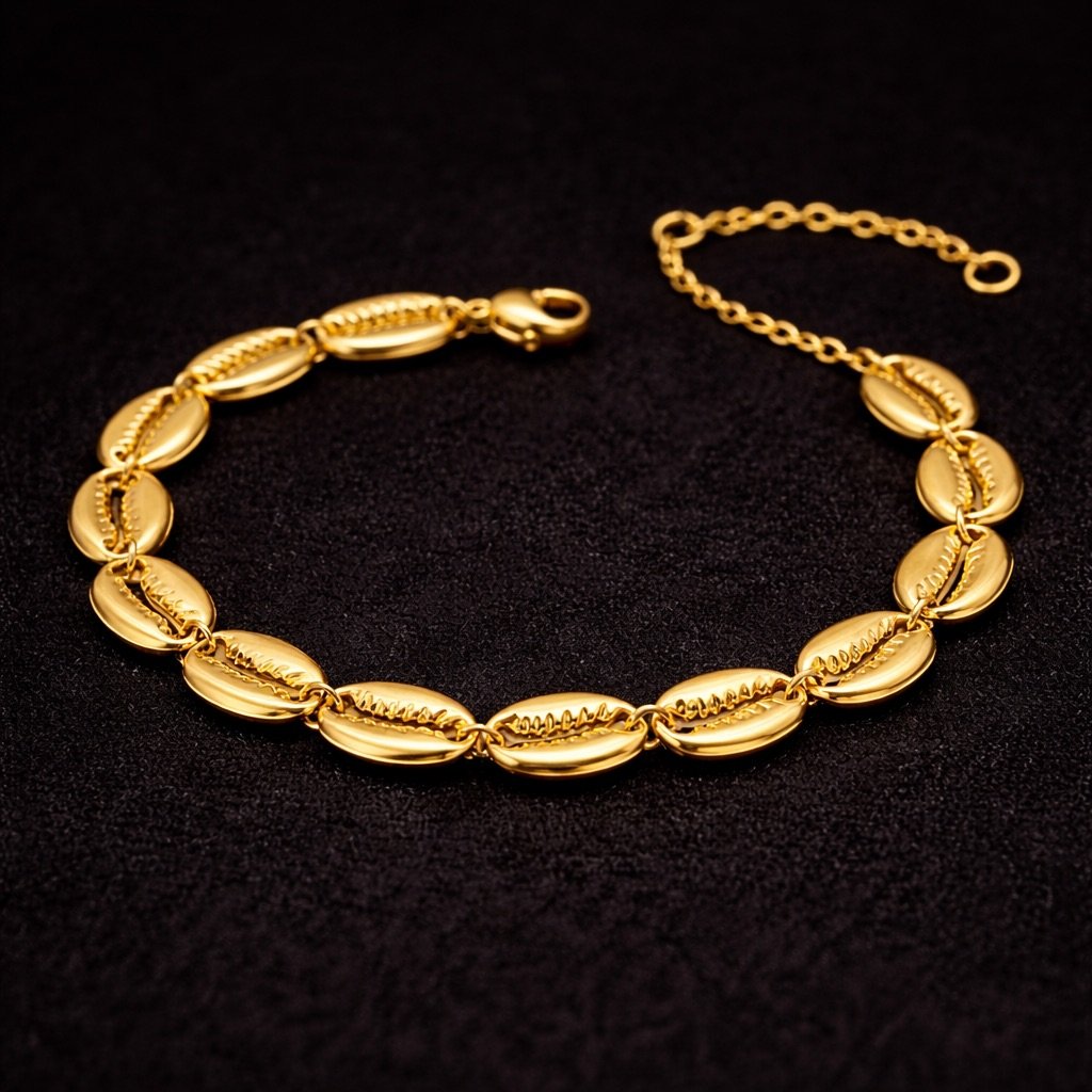 Delicate gold cowrie bracelet designed for effortless elegance. Crafted with a smooth, polished finish and lightweight feel, it adds a soft luxury glow to your everyday look. Perfect for layering or wearing alone, this timeless piece brings subtle beauty to any outfit.