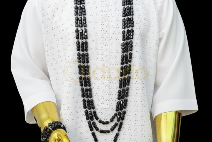 Designed with premium Onyx cube beads, accented with polished gold luxe spacers, this long double-layer necklace commands attention with its richness, balance, and timeless luxury. Paired with matching wrist beads, it completes a powerful and stylish ceremonial look.