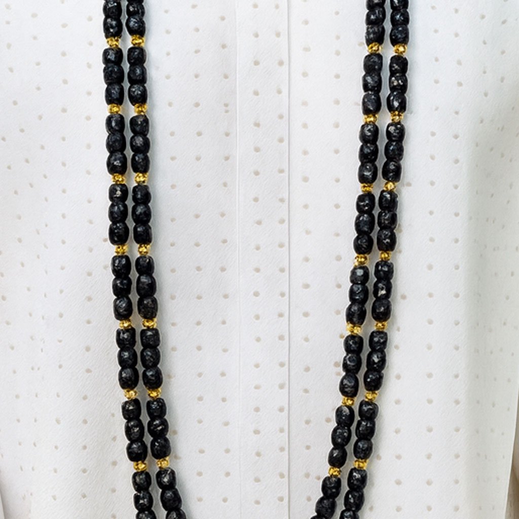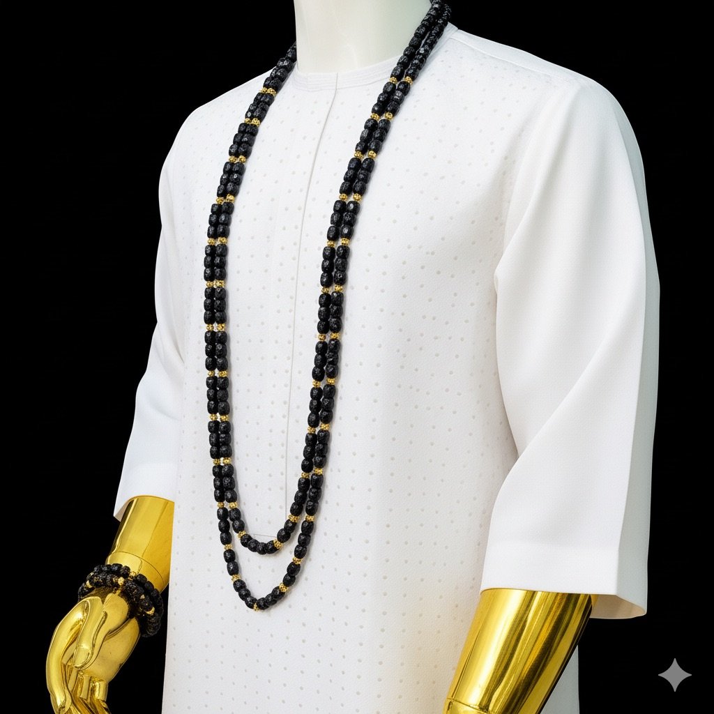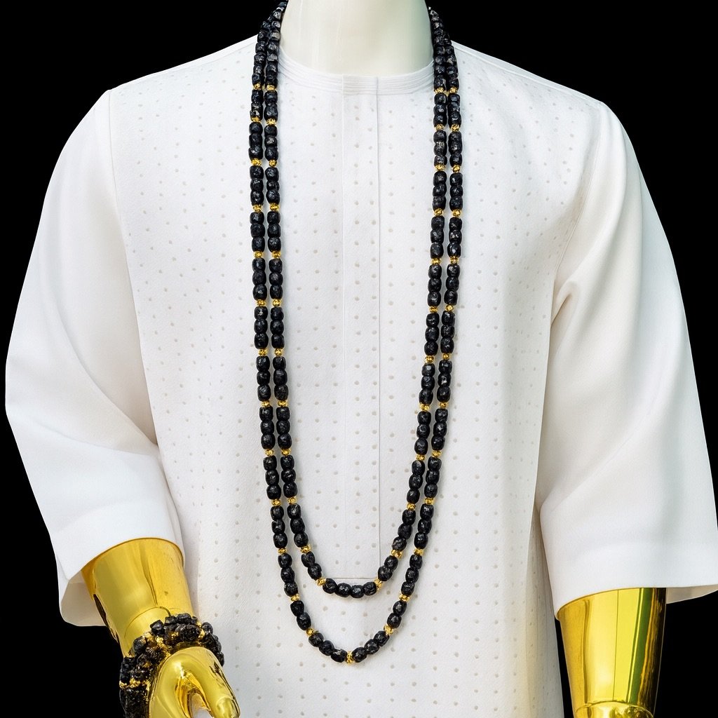 Designed with premium Onyx cube beads, accented with polished gold luxe spacers, this long double-layer necklace commands attention with its richness, balance, and timeless luxury. Paired with matching wrist beads, it completes a powerful and stylish ceremonial look.
