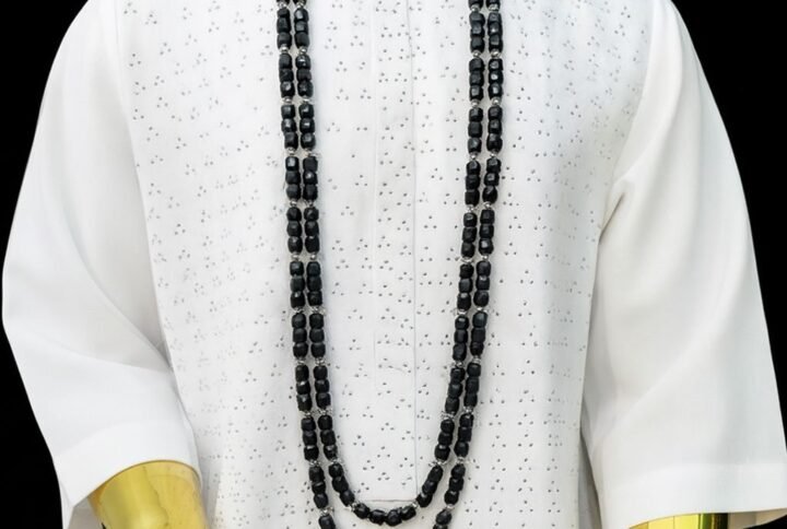 Designed with premium Onyx cube beads, accented with polished gold luxe spacers, this long double-layer necklace commands attention with its richness, balance, and timeless luxury. Paired with matching wrist beads, it completes a powerful and stylish ceremonial look.