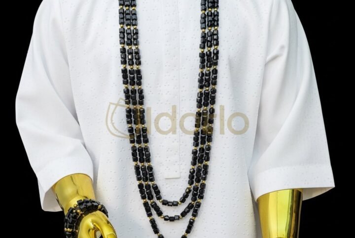 Handcrafted with sleek matte black beads and polished gold accents, this necklace commands attention. The centerpiece is a striking gold royal elegant pendant, representing power, prestige, and legacy.