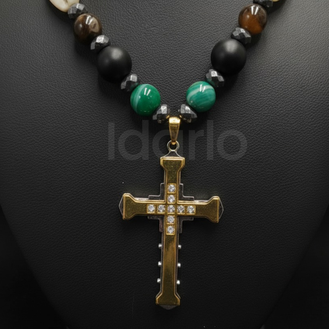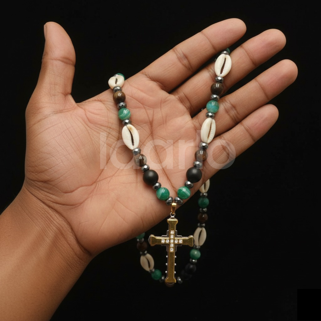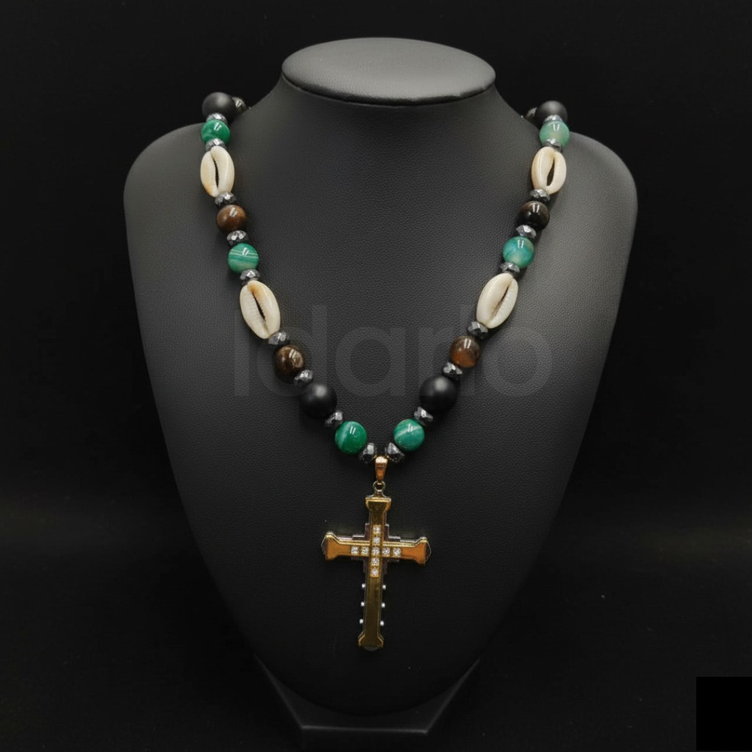 Handcrafted with care, this necklace features a harmonious mix of authentic cowrie shells, polished ebony beads, rich green stones, and golden accents, all culminating in a stunning golden cross pendant adorned with delicate detailing. The design captures both spiritual grace and cultural pride, making it a versatile piece for statement wear, special occasions, or meaningful gifting.