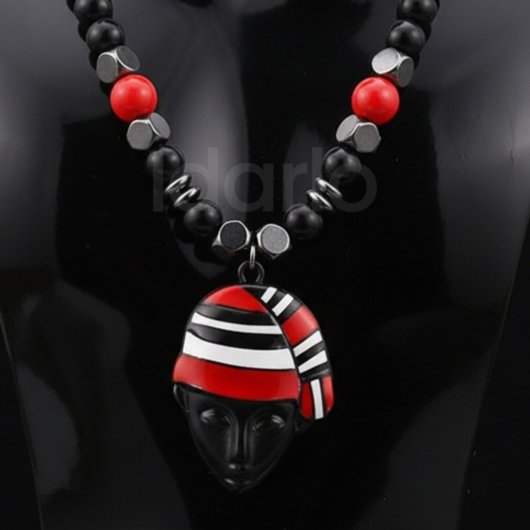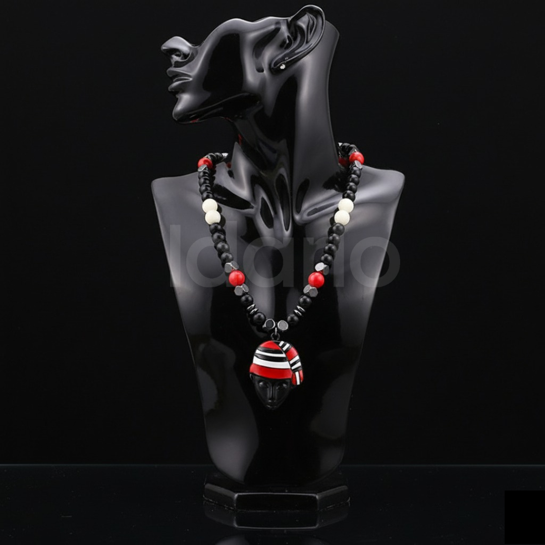 Handcrafted with precision, this striking piece features deep ebony black beads paired with bold scarlet accents and subtle ivory tones, symbolizing strength, vitality, and heritage. At its heart lies a royal mask pendant, a tribute to African artistry and regal identity, designed to capture attention and admiration.